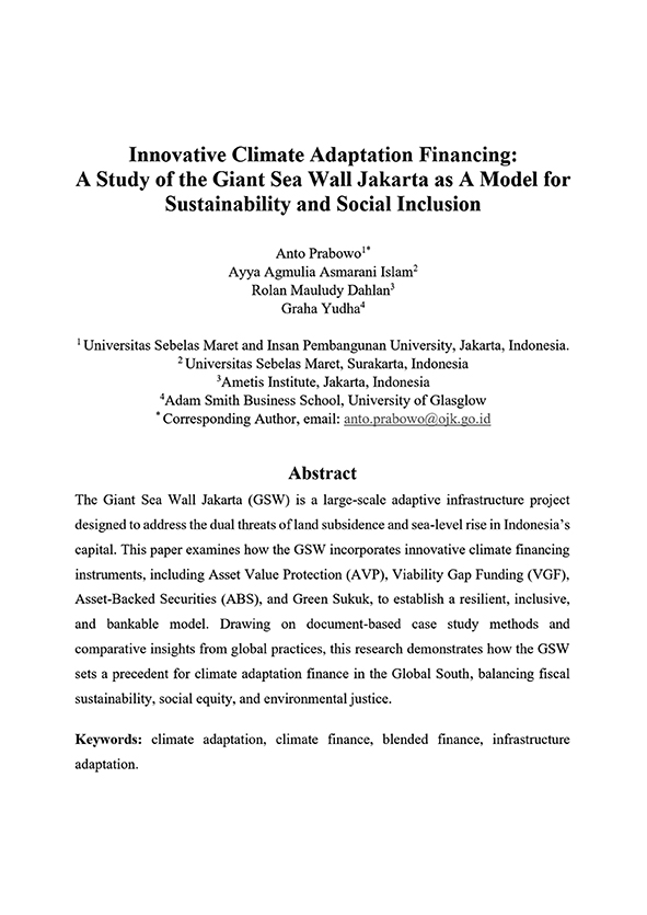 Together with colleagues from Sebelas Maret University and the University of Glasgow (Scotland), we have published a paper titled “Innovative Climate Adaptation Financing: A Study of the Giant Sea Wall Jakarta as a Model for Sustainability and Social Inclusion.” The study sets out a structured framework to design financing instruments for GSW, responding to the project’s diverse risks, timelines, and outcomes. Our goal is to translate complex financial architecture into a practical roadmap that policy makers and investors can implement. Dr. Anto Prabowo, the research coordinator, presented this study at the Sebelas Maret International Conference on Digital Economy (SMICDE) on September 4, 2025.
