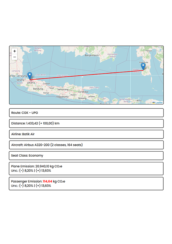 The application goes beyond basic factors. Users can select airline, aircraft, and seat-configuration options to mirror real-world itineraries; apply dynamic load factors that reflect how planes actually operate; and run uncertainty analyses to quantify the confidence range around results. That last feature isn’t just “nice to have”, uncertainty analysis is a mandated element in Indonesian regulations, yet it is frequently absent from competing tools. By embedding it, we help compliance teams meet both the letter and the spirit of local requirements.