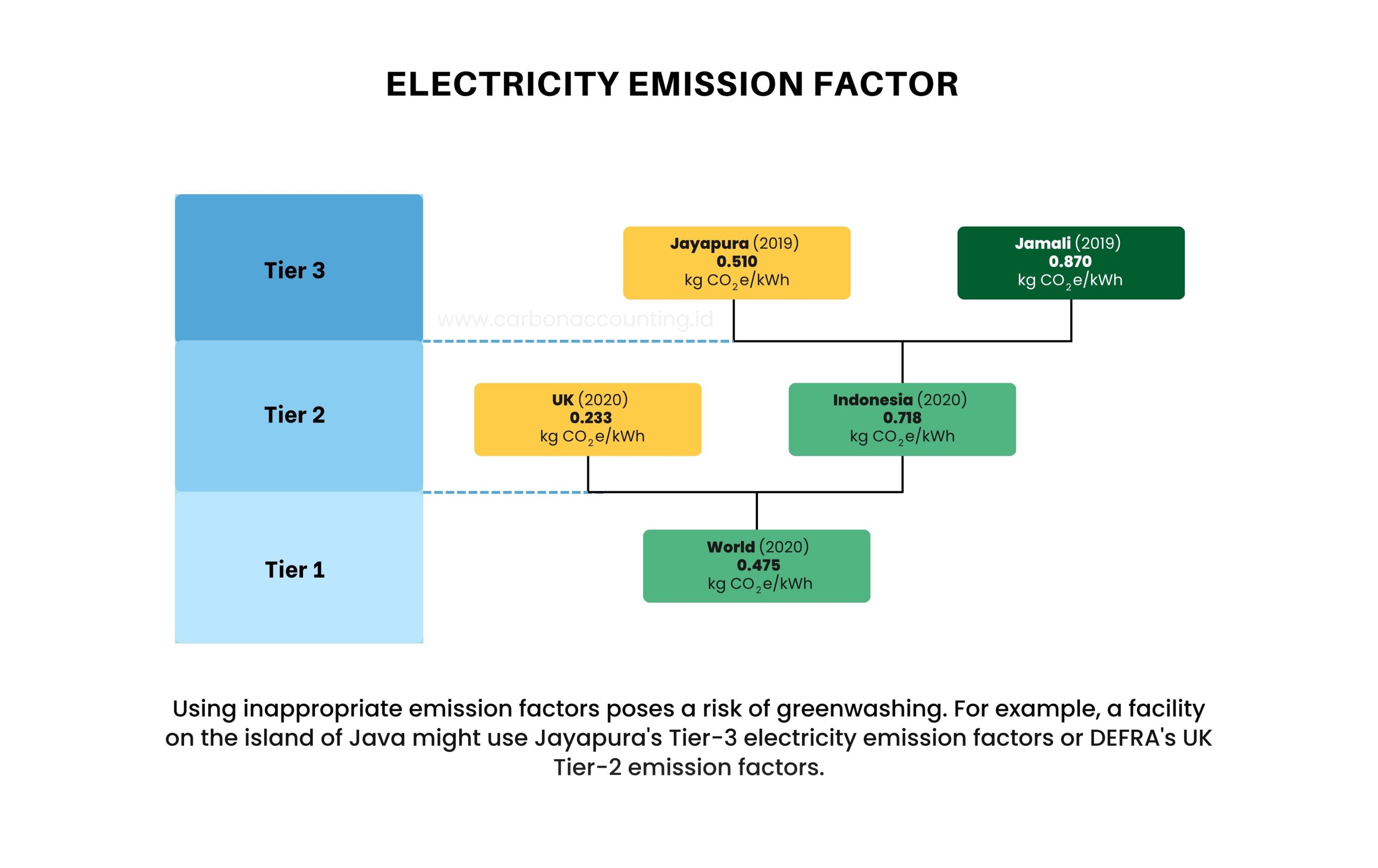 This is where the habit of borrowing factors can backfire. Emission factors are not one-size-fits-all. They encode local realities (fuel quality, technology efficiencies, grid mix) that vary by region and over time. Using DEFRA’s Tier-2 factors in Indonesia or applying a domestic Tier-3 factor from one facility to another, can distort results. A facility on Java, for example, that uses Jayapura’s electricity factor or a UK factor may understate its Scope 2 emissions, creating the illusion of progress where none exists.