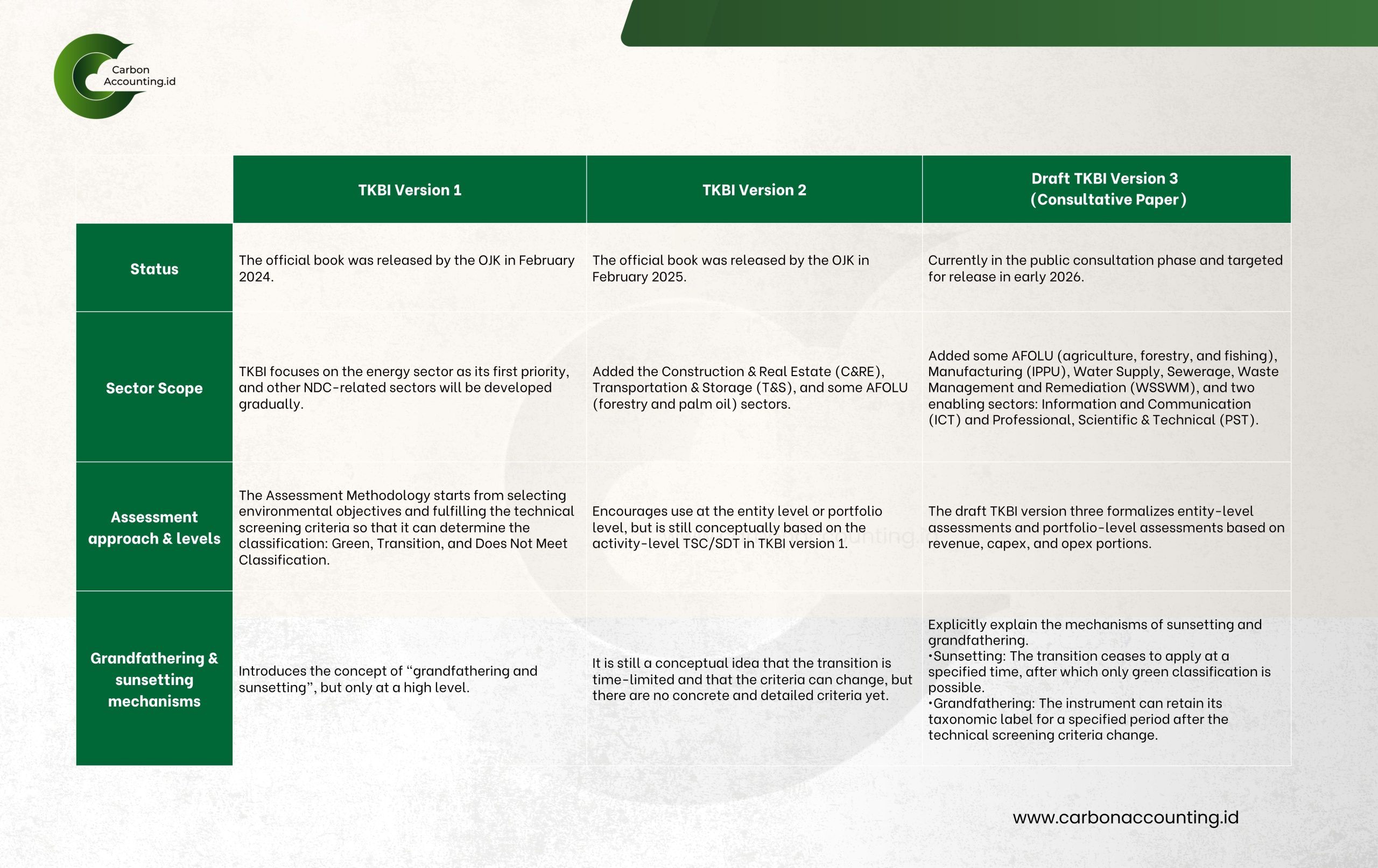 From CarbonAccounting.ID’s perspective, the evolution from TKBI Version 1 to Version 2 and now the consultation draft of Version 3 marks a steady tightening of expectations. Version 1 focused primarily on the energy sector, with a project-by-project screening approach. Version 2 expanded the scope to include construction and real estate, transportation and storage, and segments of AFOLU such as forestry and palm oil. The consultation draft of Version 3 goes much further. It adds broader AFOLU categories (agriculture, forestry, and fishing), manufacturing activities linked to industrial processes and product use (IPPU), water supply, sewerage, waste management and remediation (WSSWM), and two enabling sectors: information and communication technology (ICT) and professional, scientific, and technical services (PST).